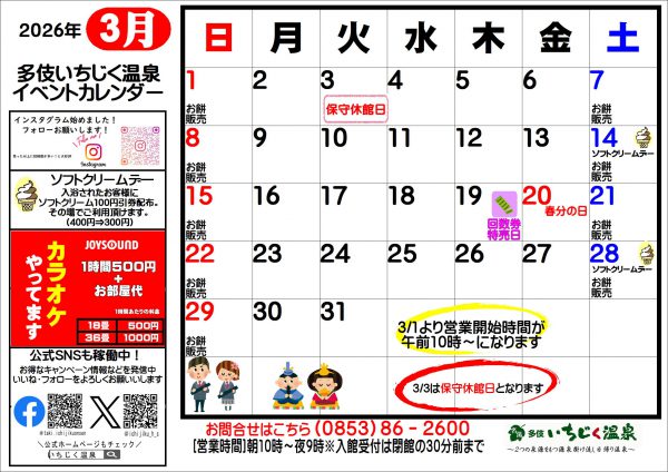 いちじく温泉3月のお知らせ♪
